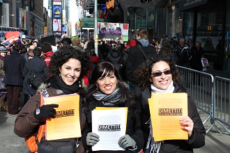 La sveglia l’ha data il grande evento del Palasharp il 5 febbraio scorso. E ieri, domenica 13 febbraio, in tutte le piazze italiane ed europee è dilagata la fiumana di donne e uomini che chiedevano le dimissioni di Berlusconi. Grazie alla tenacia e alla passione di tre giovani donne, socie di LeG, la protesta è sbarcata anche a New York. A Times Square, Valeria Castelli, Manuela Travaglianti e Elena D’Amelio, hanno riunito soci e amici italiani residenti nella grande mela, per dire basta e denunciare le gravi responsabilità di Silvio Berlusconi. “Aspettavamo un centinaio di partecipanti e invece ne sono accorsi più del doppio. E la gente continua ad arrivare” dicono le organizzatrici, sopraffatte dalla quantità di gente che, incuriosita dal raduno, chiede informazioni e per la prima volta sente parlare degli scandali che stanno travolgendo l’Italia e le sue istituzioni. E anche la casualità ci mette lo zampino, per rendere ancora più plastica la protesta. I manifestanti sono sotto l’insegna del ristorante Ruby Tuesday, ma nelle foto si legge solo parola “Ruby” perché Tuesday è oscurata.