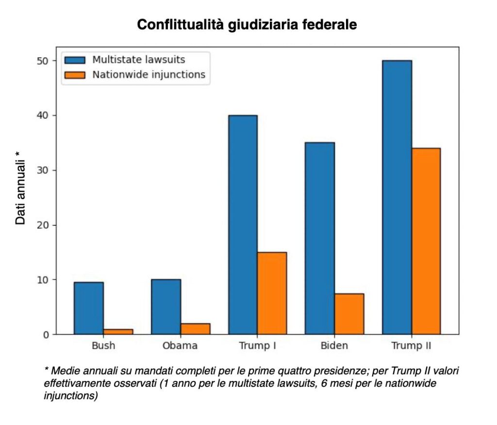La cifra di 627 cause non è verificabile. Ma un indicatore solido sono le multistate lawsuits: ossia cause coordinate tra Stati: azioni legali promosse congiuntamente da più Procuratori Generali contro il governo federale. Furono 76 negli otto anni di Bush, 80 sotto Obama, 160 nel primo mandato Trump, circa 140 con Biden. Nel solo primo anno del Trump II sono già 50: più del doppio della media annuale delle presidenze precedenti. Negli ultimi dieci anni la conflittualità coordinata è cresciuta sotto entrambi i partiti, accelerando nettamente nell’ultima fase.
