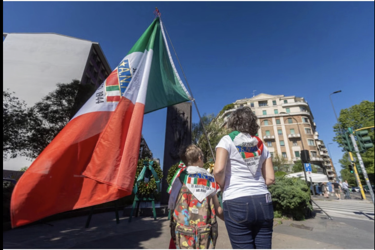 Nello stesso momento, a Milano, una marea democratica simile a quella che nel 1994 contribuì alla caduta del governo Berlusconi, veniva fermata per ore, costretta a sfilacciarsi in rivoli e a giungere con grande ritardo e alla spicciolata in piazza del Duomo. La testa del corteo era stata bloccata dalla Brigata ebraica, scortata da agenti della Questura all’incrocio dove istituzionalmente prendono posto i gonfaloni dei Comuni, lo striscione del Comitato permanente antifascista e l’Anpi. La presenza, tra quei manifestanti, di bandiere israeliane, iraniane e americane, insieme ai ritratti di Donald Trump e dello scià di Persia, veicolava nel cuore della commemorazione della Liberazione dal nazifascismo e dell’impegno costituzionale per la pace un visibile e provocatorio sostegno all’aggressione dell’Iran da parte di Israele e degli Stati Uniti.