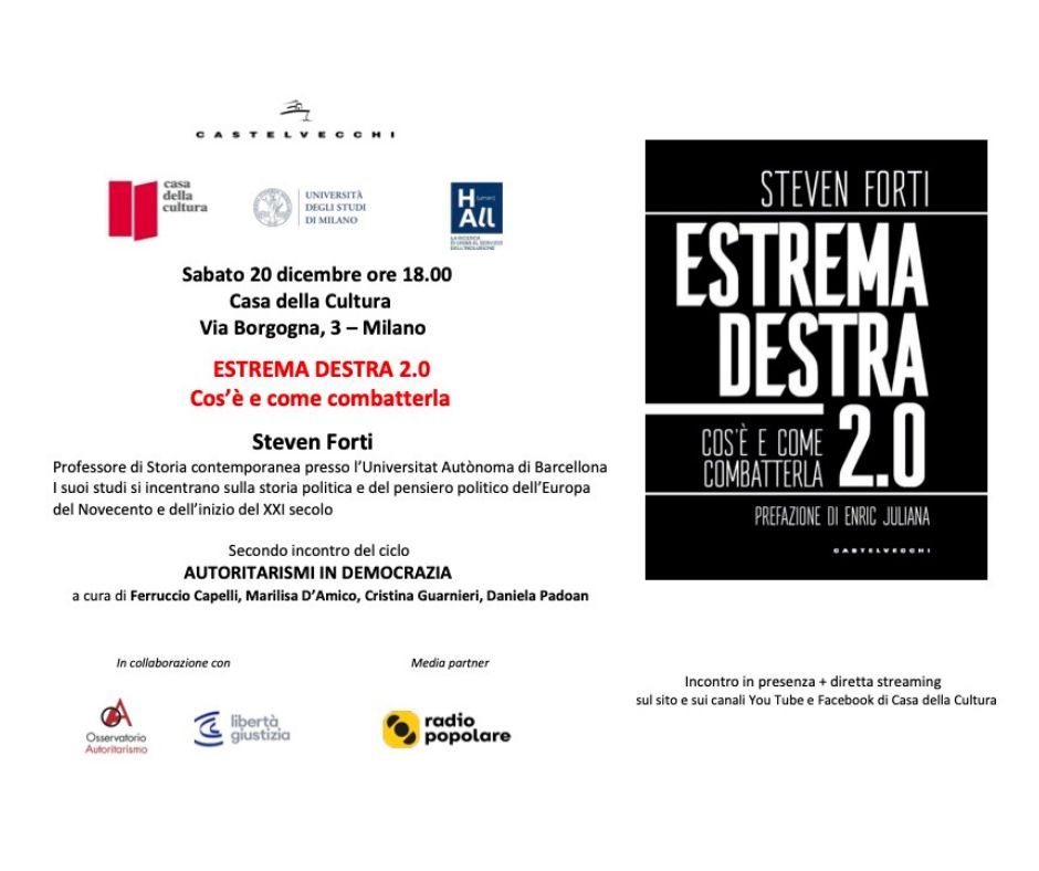 “Estrema destra 2.0. Cos’è e come combatterla” è il libro di Steven Forti, Castelvecchi editore, attorno al quale ruota questo secondo incontro del ciclo “Autoritarismi in democrazia“. Qui tutti gli appuntamenti 2025\2026.