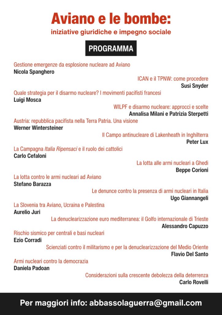 “Aviano e le bombe, iniziative giuridiche e impegno sociale. Dal genocidio in Palestina all’olocausto nucleare”, presso la Sala congressi Hotel Minerva, Via Bertossi n° 22, dalle ore 09.30 alle 17.30 (con pausa pranzo dalle 12.30 alle 13.40).