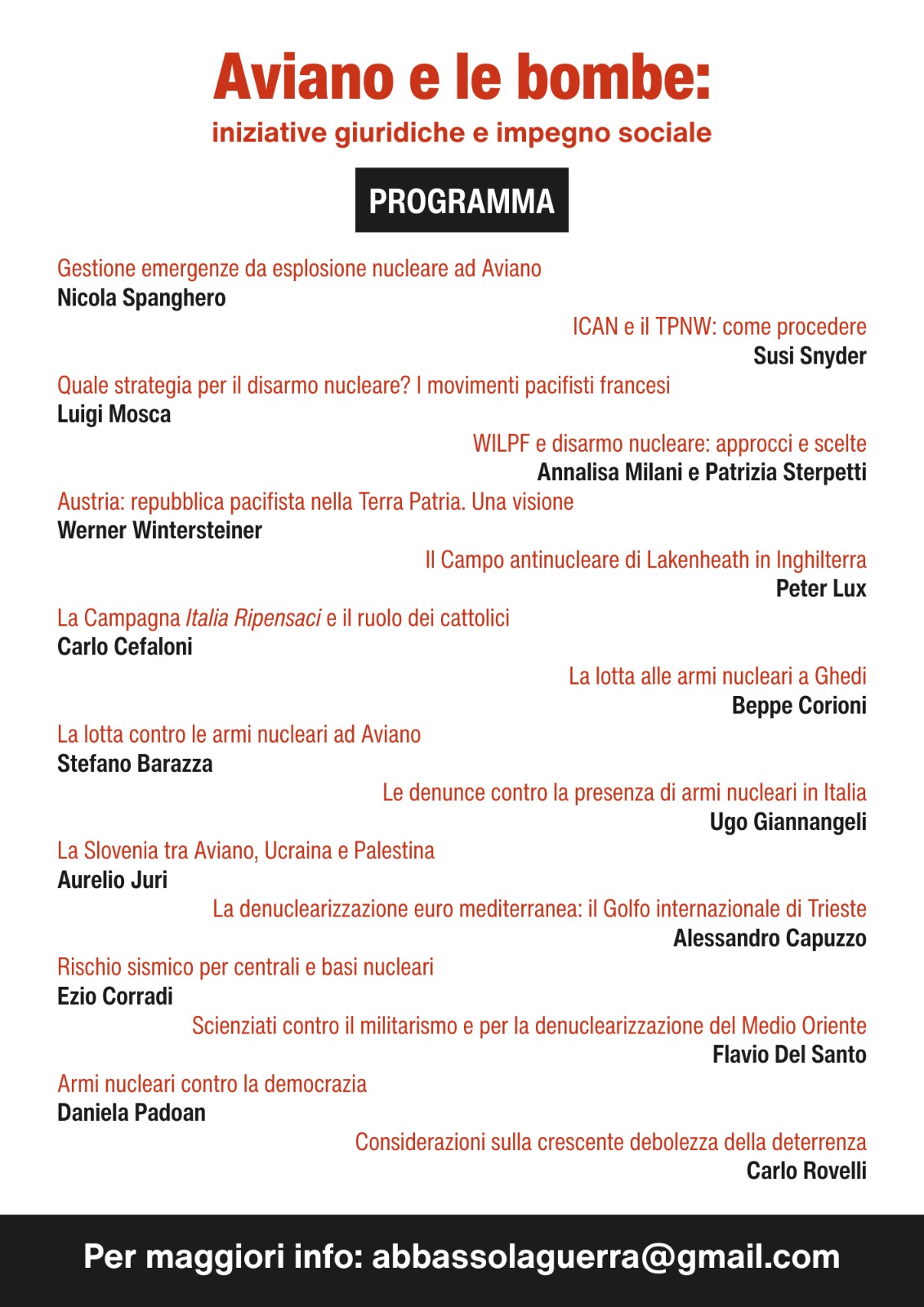 “Aviano e le bombe, iniziative giuridiche e impegno sociale. Dal genocidio in Palestina all’olocausto nucleare”, presso la Sala congressi Hotel Minerva, Via Bertossi n° 22, dalle ore 09.30 alle 17.30 (con pausa pranzo dalle 12.30 alle 13.40).