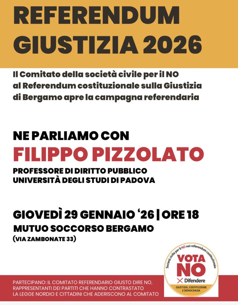 Il 21 gennaio 2026, alle ore 11, allo Spazio della Fondazione Serughetti La Porta, è stata presentata la costituzione, anche a Bergamo, del Comitato per il No al referendum costituzionale sulla Magistratura, che aderisce al Comitato nazionale della società civile costituito a Roma il 10 gennaio e presieduto da Giovanni Bachelet.