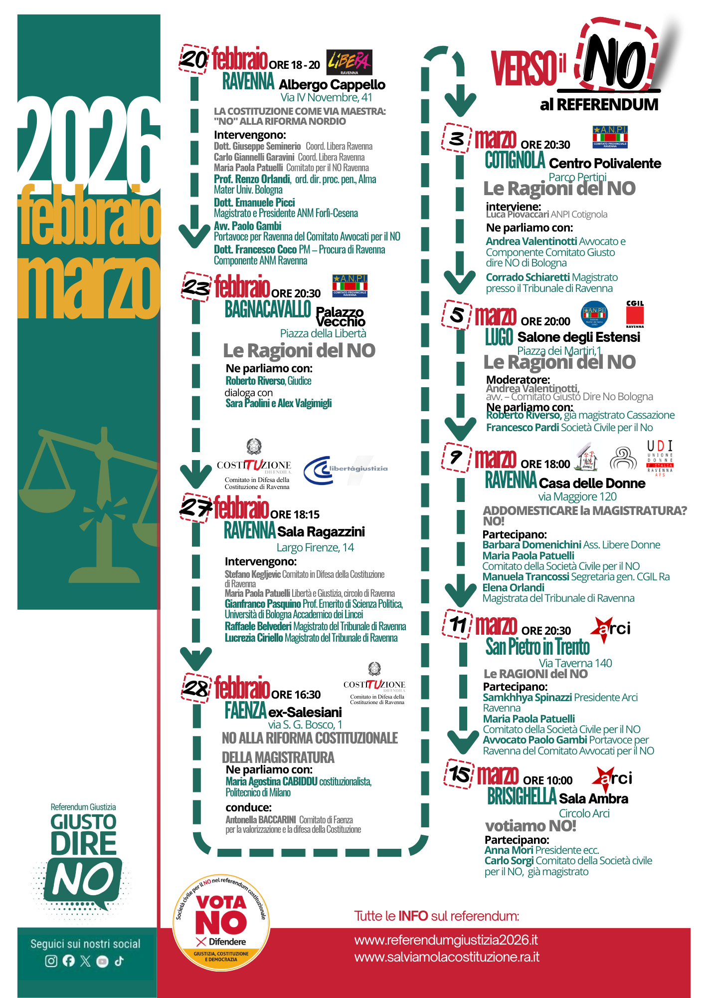 È una rassegna fitta su tutto il territorio, quella promossa dal Comitato della società civile per il NO della provincia di Ravenna. Il prossimo appuntamento è per sabato 21 con Carlo Guglielmi, avvocato. L’incontro si terrà alle 19.30 al circolo Arci Casablanca di Villanova di Bagnacavallo. Di seguito il comunicato stampa del Comitato e la locandina con tutti gli altri incontri sul territorio.
